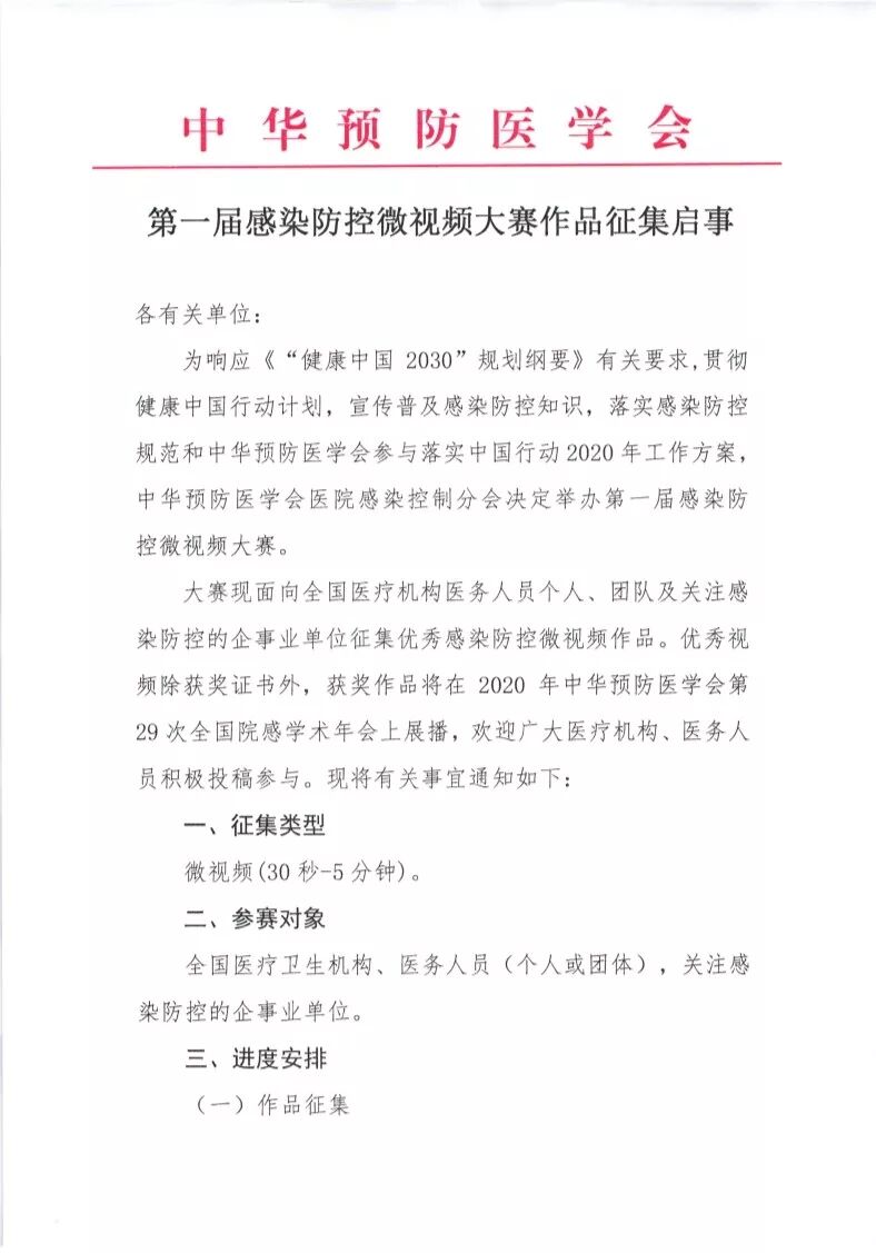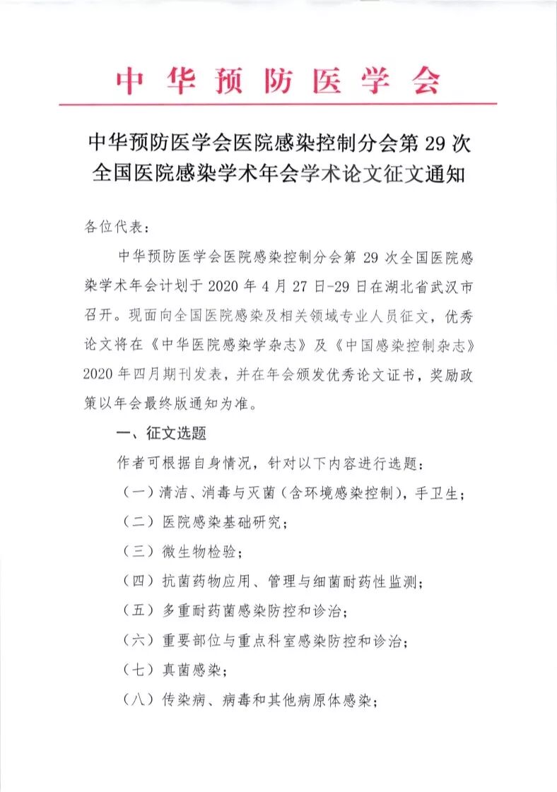 中华预防医学会关于举办第29次全国医院感染学术年会的第一轮通知(含征文、演讲比赛、微视频大赛通知)