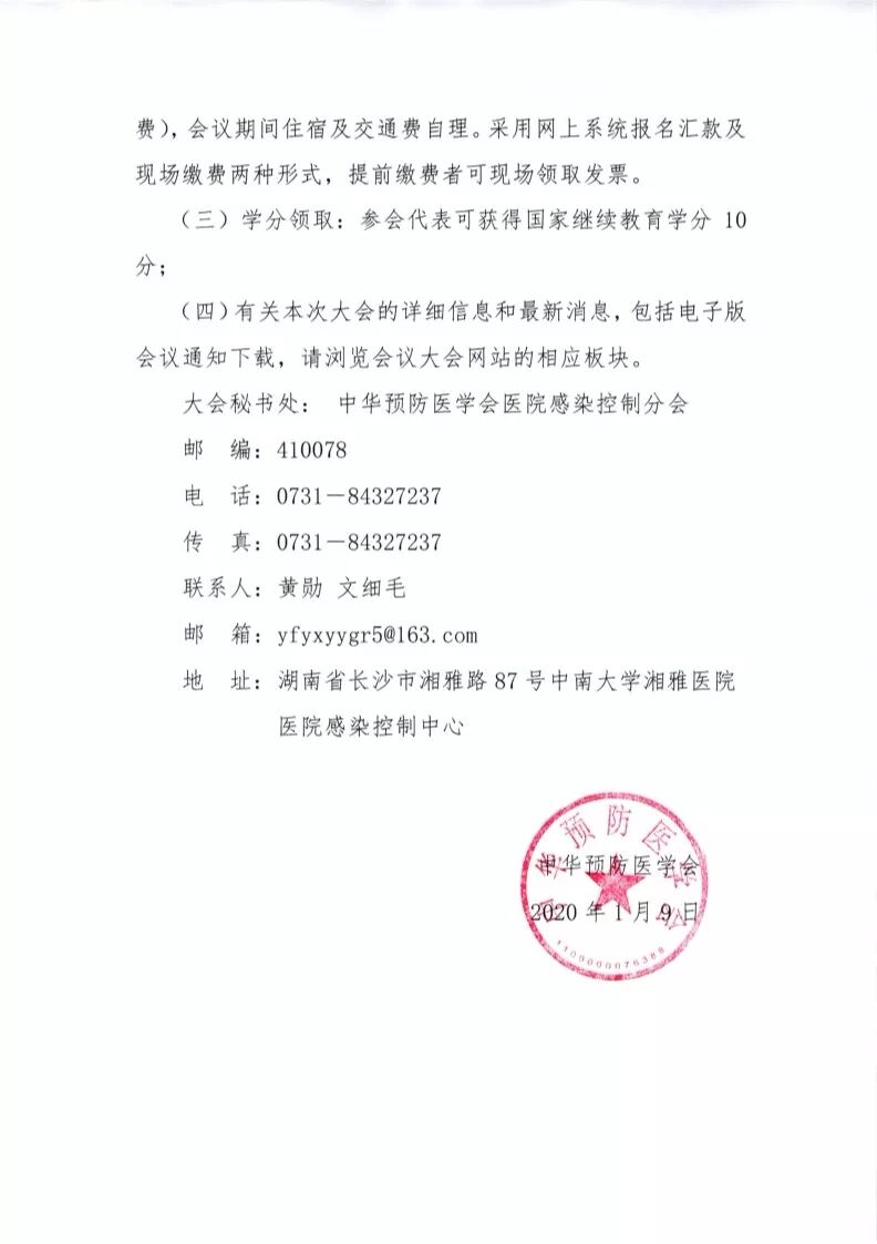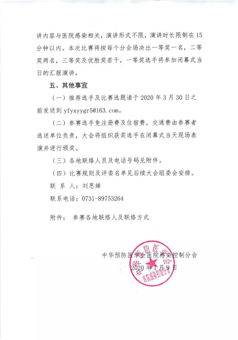 组织机构 (一)主办单位:中华预防医学会医院感染控制分会。 (二)协办单位:全国医院感染监控管理培训基地、湖南省医院感染管理质量控制中心。 (三)承办单位:中南大学湘雅医院、湖南省预防医学会医院感染控制专业委员会。 (四)学术支持单位:中华医院感染学杂志、中国感染控制杂志。 会议时间 2020年4月27日全天报到,会前会27日下午,4月28—29日会议,29日下午离会。 参会对象 (一)第五届医院感染控制专业委员会全体委员,推荐的增补委员和学组成员; (二)各级医院感染管理质量控制中心主任、秘书; (三)各级疾病控制中心和卫生监督部门从事消毒、传染病管理和医院感染防控工作的专业人员; (四)主管医院感染的医院院长或副院长; (五)医院感染管理处(科或办公室)负责人及医院感染管理专(兼)职人员; (六)医务处(科)、医疗质量控制部门、预防保健科、护理部、检验科、药剂科、ICU、手术部、消毒供应中心、血液透析中心、内镜室、口腔科、感染性疾病科、呼吸科、血液科、移植病房、新生儿室等部门的管理人员、临床医生、临床药师、检验人员以及护理人员。 会议征文 会议投稿论文拟将会议征文通过杂志发表、口头交流、壁报交流等形式,杂志发表截稿日期为2020年2月29日,口头报告和壁报交流截稿日期为3月30日。具体时间及要求以大会网站通知为准。 征文内容包括:(1)清洁、消毒与灭菌(含环境感控);(2)手卫生;(3)微生物检验;(4)抗菌药物与耐药性监测;(5)多重耐药菌防控和诊治;(6)重要部位感染防控和诊治;(7)真菌感染;(8)传染病、病毒和其他病原体感染;(9)免疫抑制患者感染;(10)医院感染暴发;(11)医院感染监测与疾病负担;(12)职业安全、PPE与锐器伤;(13)网络信息技术与医院感染监控软件;(14)持续质量改进与医院评审督查;(15)其他:医疗废物、培训、疫苗、建筑等。 会议将评选优秀论文并颁发优秀论文证书,论文评选要求请详见“大会征文通知”。 会议地点和住宿 湖北省武汉市,酒店具体地点待定。 其他事宜 为响应《“健康中国2030”规划纲要》有关要求,弘扬医院感染管理的奉献精神,激发广大青年院感工作者爱岗敬业的工作热情,中华预防医学会医院感染控制分会拟在第29次全国医院感染学术年会举办“爱院感·致青春”演讲比赛及第一届感染防控微视频大赛。 详情请见通知。 通 知 (封面图片来源于网络)